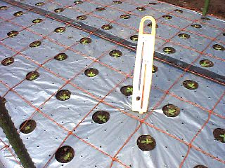 4月16日に定植したトルコギキョウ。温度計は必需品、これは地温と気温を同時に測れるタイプ。ネットのますめは12p×12p。
